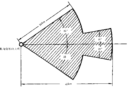 4.1.3  航向信標臺向飛機著陸方向發射水中極化的扇形合成場型,其覆蓋區為,以航向信標臺大線為基準,在跑道中心延長線±10o以內為45km,在10o~35o之間為30km(圖 1)。