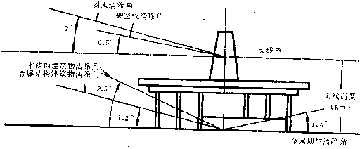 5.7.2  以天線為中心,半徑150m以內不得有樹木,距大線150~300m之間不得有高于9m的獨立樹木,300m以外樹木的高度不應超過以天線項部為準 2o垂直張角。